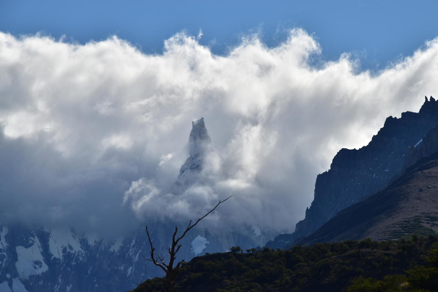 It stayed sunny on the route of the walk back to El Chaltén, but cloud drifted in from the Icefield and Cerro Torre disappeared for a while. And made an atmospheric return just before we dropped down into town.