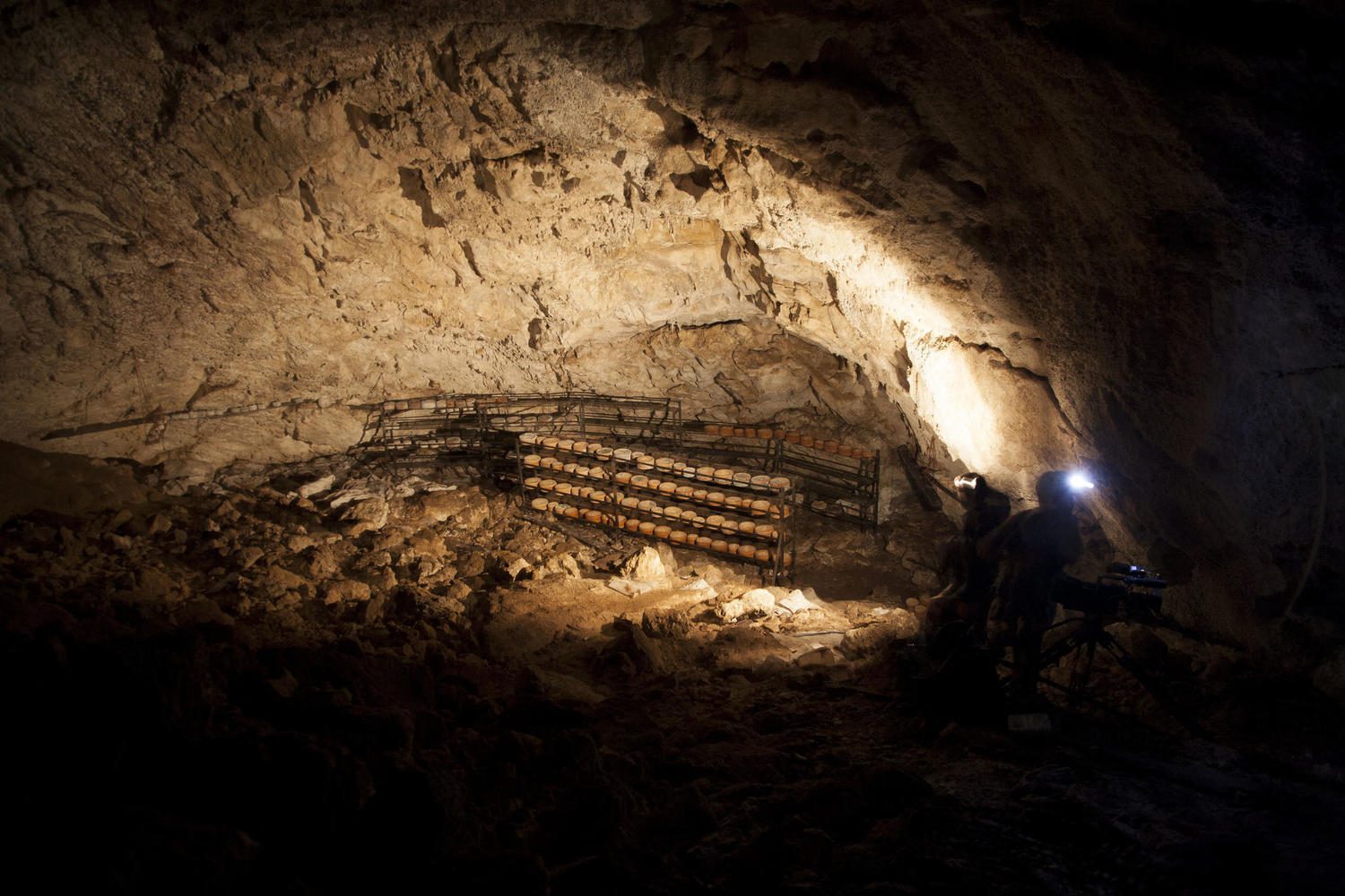 When the salting of the cheese was done, we followed Ruben and his donkey, charged with big pieces of cheese already dried and smoked, on their way to the cave where they will be stored for at least two months. It's a 20 minute walk to the mouth, where a small hole in the rocks leads to a 10-metre vertical staircase down. We followed his footsteps down into the dark and the cave opened out into an immense room. Hundreds of cheeses rested on the wooden shelves, letting the cave mosses travel slowly into its core to give it its unique taste.