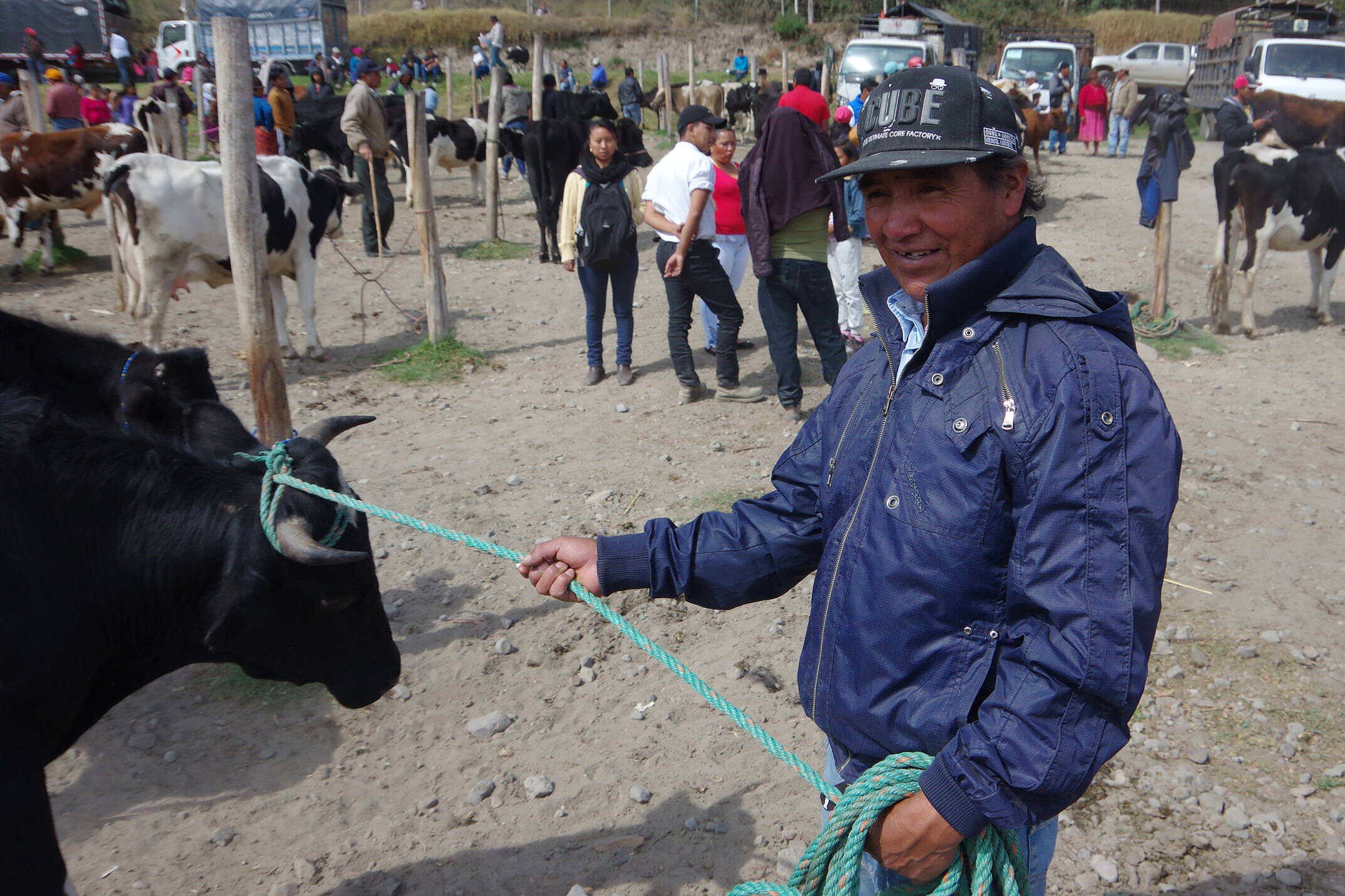 From here we walk out of the lodge and through rolling farmland, passing terraced hills and rows of eucalyptus trees, their leaves almost blue in the early morning light. Horses and cattle interrupt your passing-by with interest and no small amount of surprise. Cockerels crow their morning greetings, the odd dog barks, mist hangs in the air and fallen melons gather on the ground. Everything is calm. The grass is green, fields are wide and the air is fresh. This is how the animals sold at Otavalo live throughout the highlands, on small scale farms such as these. Organic is not an optional upgrade.