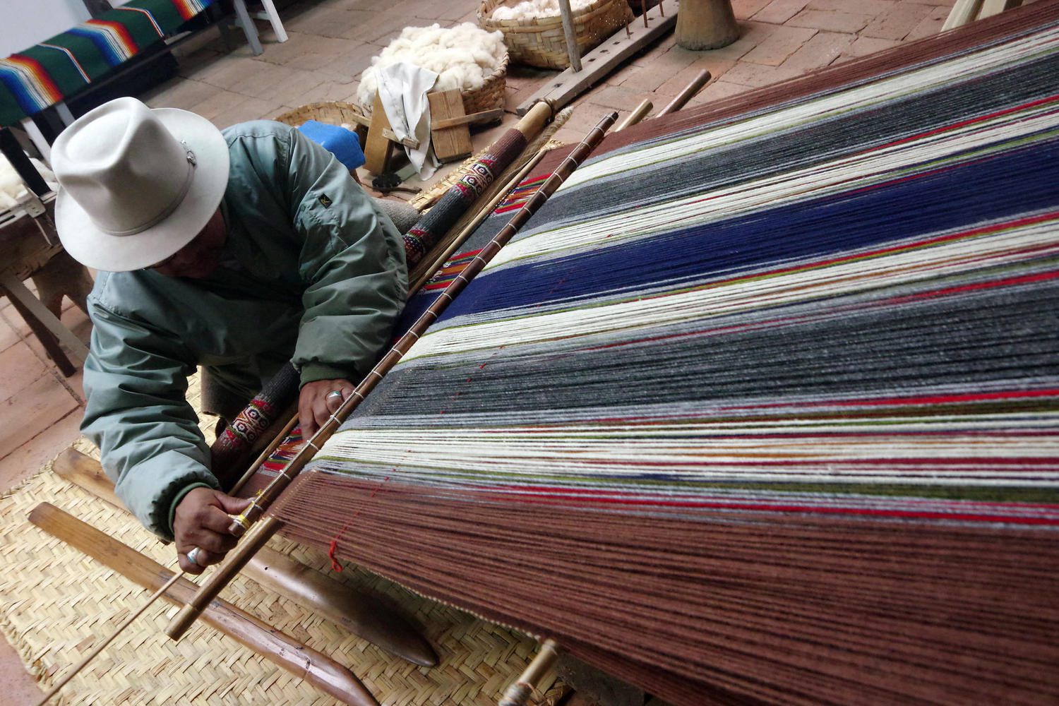 Miguel moves slowly but purposefully as he spins the long strands of alpaca wool. In doing so he retraces the steps that he has taken for decades, and which his ancestors would have taken centuries earlier. There would have rarely have been an audience, as there was today. The onset of age has slowed his rhythm, but the dedication and precision remain. Son-in-law Rafael steps in for the weaving demonstration. He too is in no rush.