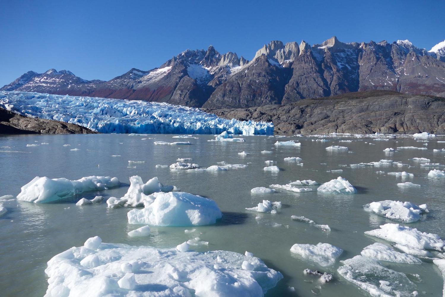 The path is so well tended because it's along here that passengers walk to take the boat ride to the face of Glacier Grey (well worth it by the way). The path reaches the dark sand beach at its very western edge so you just bear off to your right to reach the water's edge. The further along the beach you go, the more of a view you will have of the distant glacier face (it's around 8km from the beach to the ice). However, there are often large icebergs floating near the beach as they are blown down the lake. In some years these icebergs are so numerous that you can walk out onto them straight from the shore.